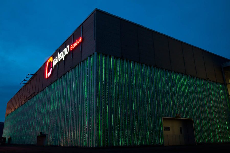 Façades en tôles aluminium éloxées roulées, LED intégrés derrière les tôles perforées, portes coulissantes en métal 11.3m x 6.0m.